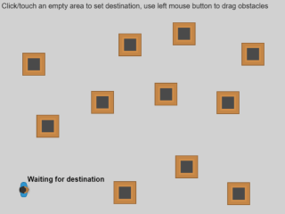 The Pathfinding behavior allows to move objects to a selected destination as well as to flag items as obstacles. Objects that are flagged as obstacles will be avoided by the moving objects.
