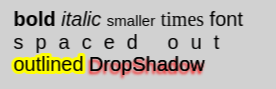 [outline=#hexColor]text with an outline in a specified color[/outline][shadow=#hexColor]text with a dropshadow with a specified color[/shadow][spacing=12] text with extra spacing between the letters[/spacing][align=center]text that is centered (you can also use left and right)[/align]