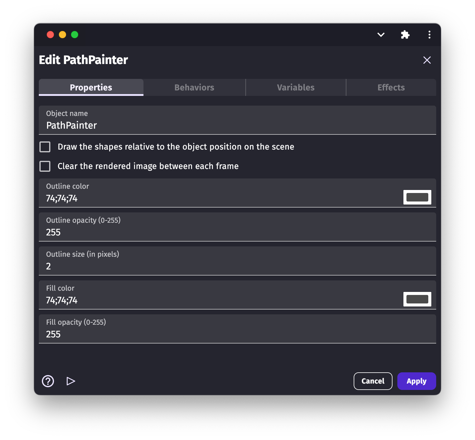 The Shape Painter object properties allow us to change the outline colour/color of the object, the fill colour/color of the object, the opacity of each colour/color, and the outline size of our object.