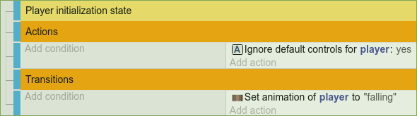 Since we already set the condition about when to execute the code of the init state in the main scene events sheet we can leave out the condition here and just add actions.