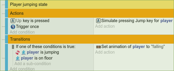 Switch to the event editor (“main” scene) and create these external events “playerstateinit”, “playerstatefalling”, “playerstateidle”, “playerstatewalking”, “playerstatejumping”. In the events of your main scene create a new event group from the drop-down menu on the right-hand side. Name it “Player logic”. Now add a "At the beginning of the scene" condition. Add a sub-event to the condition and link in the external event sheet “playerstateinit” via the “add”/”other” button. Do the same for all the other player states.