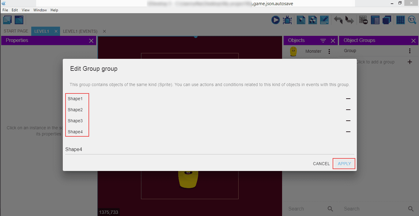 Remember to not add the Monster to that group, only the shapes.