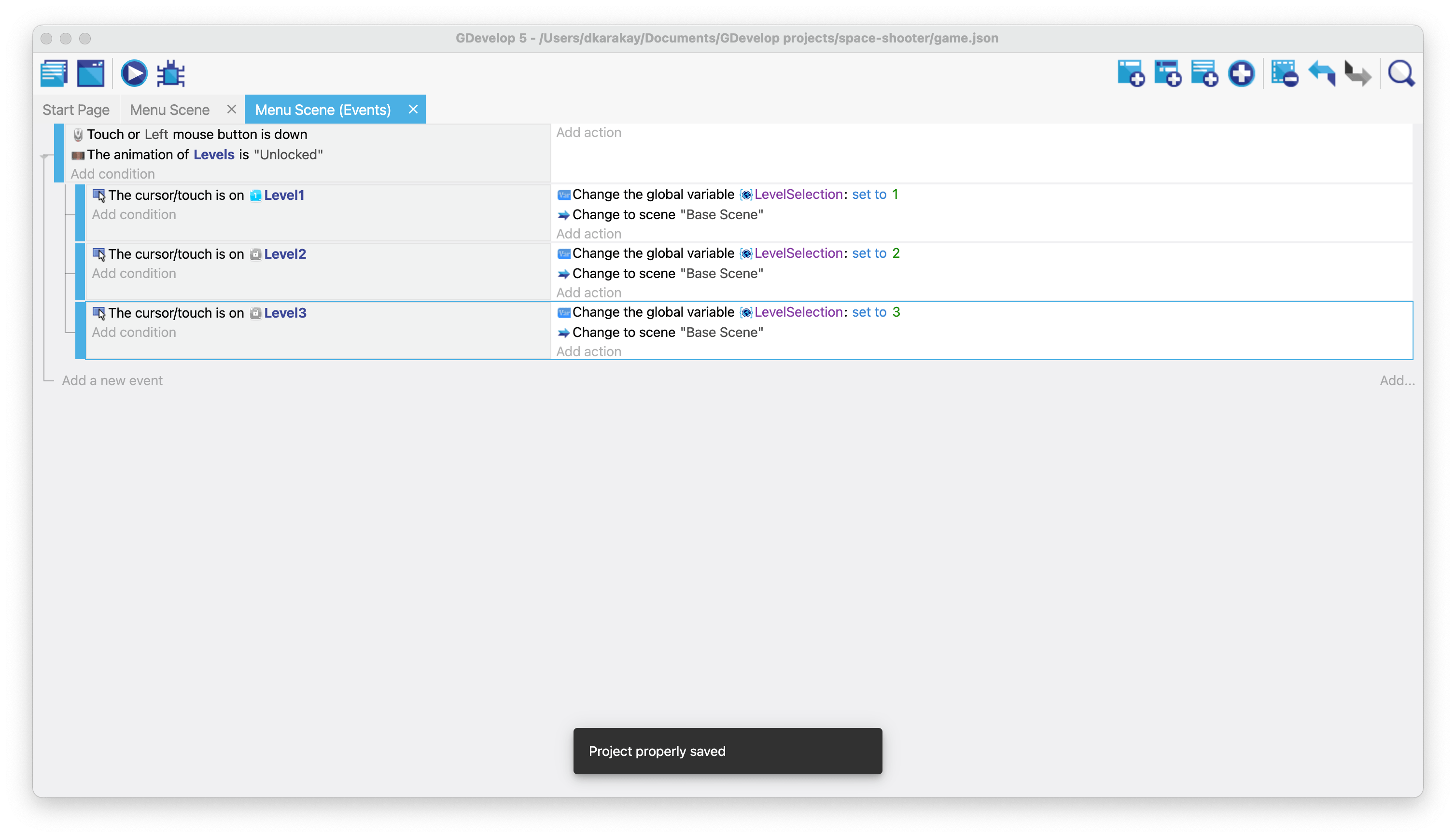 Create a new global variable called "LevelSelection" and set its initial value to 1. Then, change this variable to open the specific level (e.g., change it to 2 to load Level 2). Then add an action to run Base Scene. In the end, your events should look like this: