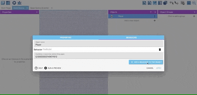 Select the three dots next to the Player object and click Edit object. Then, click the Behaviors tab.