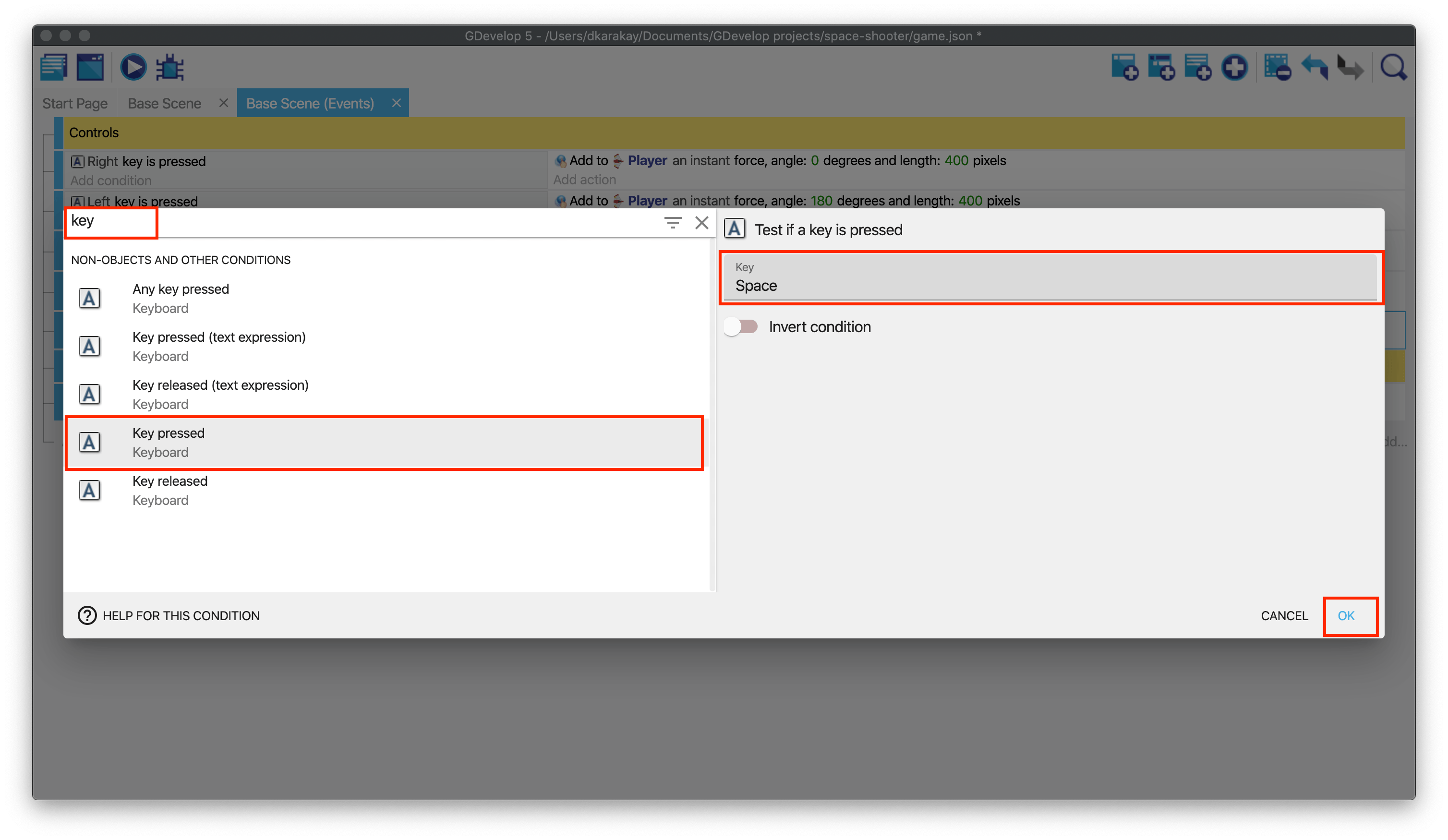 Then, open the Events page. Add a new event. Click on add a condition and type "key" to check whether the Space key is pressed or not.
