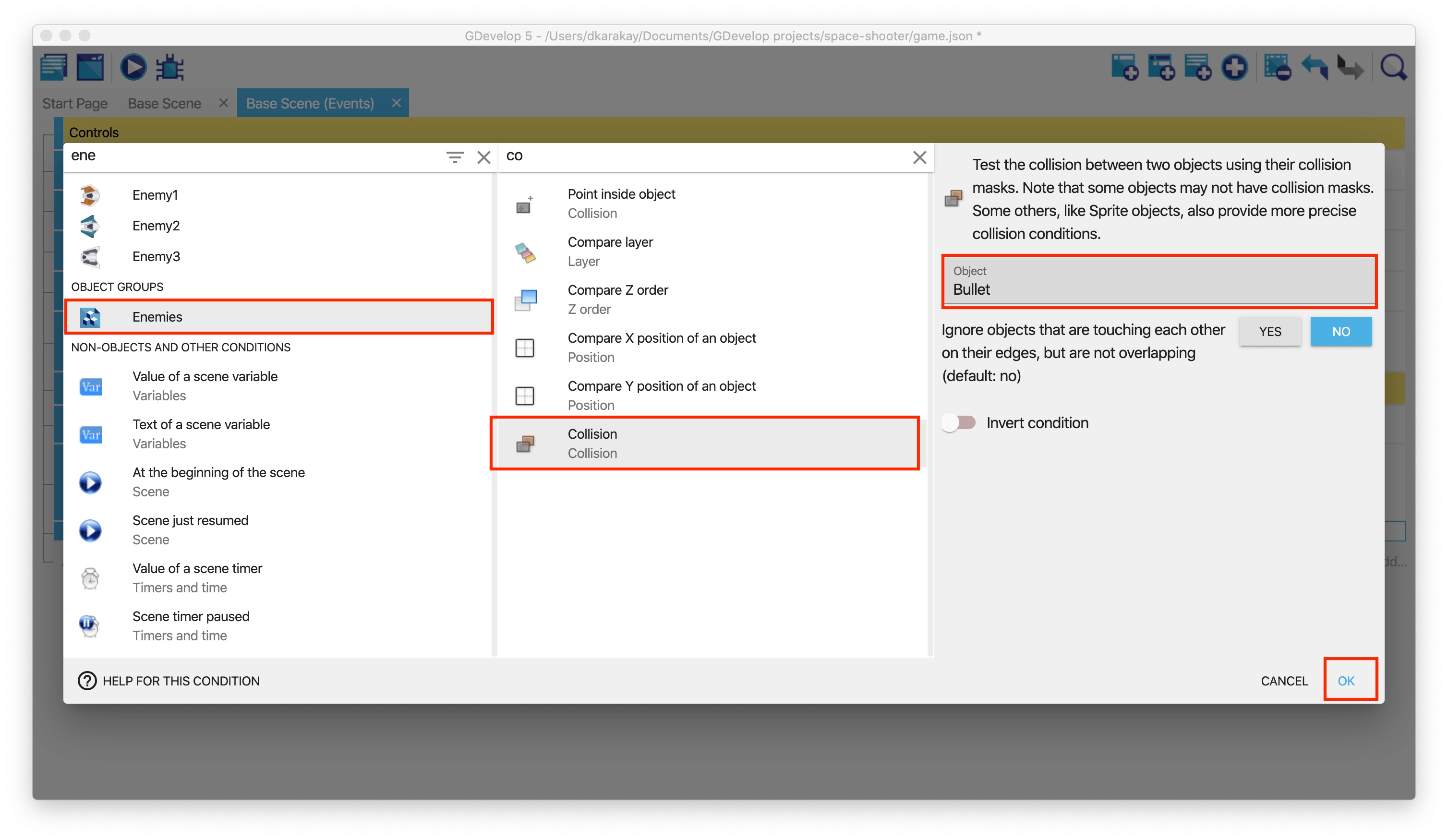 We will add a few actions to shoot the enemies. Firstly, open the Events tab. Then, add a new condition, choose the Enemies object group that we created before. Select action as Collision and the object as Bullet; by doing that, we can track the collision between our bullet objects and the enemies.